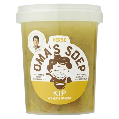 Groentebouillon (water, zout, maïszetmeel, uienpoeder, wortel, knoflookpoeder, gemalen lavas, peterselie,foelie, kurkuma, witte peper en zonnebloemolie), kippendij (10%), ui, prei, bleekSELDERIJ, wortel, aardappelzetmeel,gistextract, peterselie, zout, kurkuma, witte peper, tijm, zwarte peper, rozemarijn, laurier en foelie.