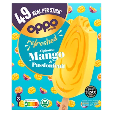 Ingrediënten: Alphonso mangopuree (41%), water, oplosbare maïsvezel, passievruchtensap (7%), oligofructose, glucosestroop, zoetstoffen: erythritol en steviolglycosiden uit stevia, zetmeel, wortelsap, mangopuree, emulgator: mono- en diglyceriden van vetzuren, stabilisatoren: johannesbroodpitmeel, guarpitmeel, pectinen, geconcentreerd citroensap, natuurlijke aroma's