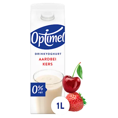 Magere drinkyoghurt met aardbeien- en kersensap, gezoet met zoetstof.