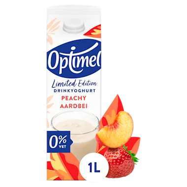 Magere drinkyoghurt met aardbeien- en perziksap, gezoet met zoetstof.