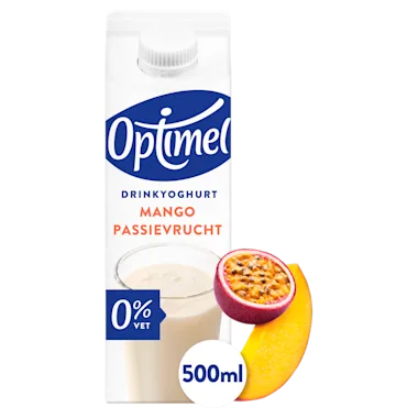 Drinkyoghurt Mango Passievrucht. Magere drinkyoghurt met mango- en passievruchtensap, gezoet met zoetstof