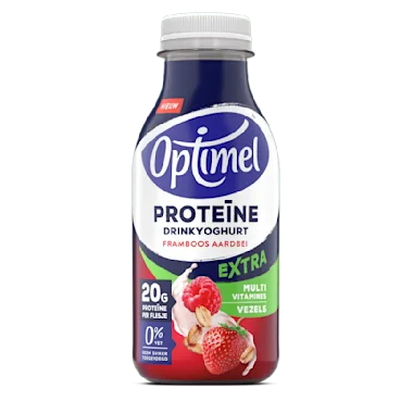 Magere drinkyoghurt met framboos- en aardbeisap, vezels, toegevoegde B-vitamines, vitamine D en E, gezoet met zoetstof.