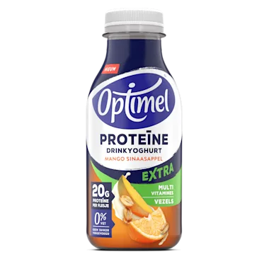 Magere drinkyoghurt met mango- en sinaasappelsap, vezels, toegevoegde B-vitamines, vitamine D en E, gezoet met zoetstof.