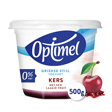 Optimel Griekse stijl yoghurt Kers. Magere yoghurt Griekse stijl, met een laagje vruchten, gezoet met zoetstof.