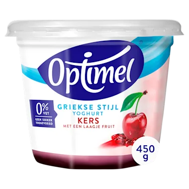 Griekse stijl yoghurt Kers. Magere yoghurt Griekse stijl, met een laagje vruchten, gezoet met zoetstof.