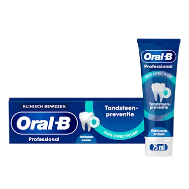 Oral-B Professional Tandsteenpreventie Reinigingskristallen tandpasta is klinisch bewezen: tot 100% sterker effect op het voorkomen van tandsteen in vergelijking met gewone fluoridetandpasta. Oral-B's unieke antibacteriële technologie met Tinfluoride-Complex creëert een universeel beschermschild. De reinigingskristallen zorgen voor een intens schoon gevoel en het actieve zink helpt bacteriële tandplak te bestrijden én voorkomen gedurende 24 uur bij twee keer per dag poetsen