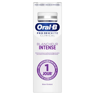Oral-B Pro 3D White Clinical Intensieve Whitening tandpasta zorgt klinisch bewezen voor wittere tanden vanaf de eerste dag door het verwijderen van oppervlakkige verkleuringen. Het is met zijn unieke ionic-Technologie de beste whitening-tandpasta van Oral-B: Het verwijdert verkleuringen zonder te schuren, verwijdert ze door middel van ionic-Whitening-technologie en beschermt de tanden tegen nieuwe verkleuringen – Geschikt voor gevoelige tanden.