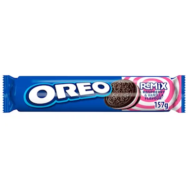 Oreo Remix is een uniek koekje met twee cacaohelften en een heerlijke frambozen & vanille crèmevulling.