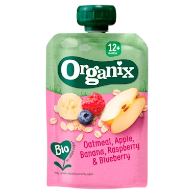 Een lekker 100% biologisch Organix fruithapje met havermout, appel, banaan en framboos in een handig knijpzakje. Het perfecte tussendoortje en ideale fruithapje voor je peuter!