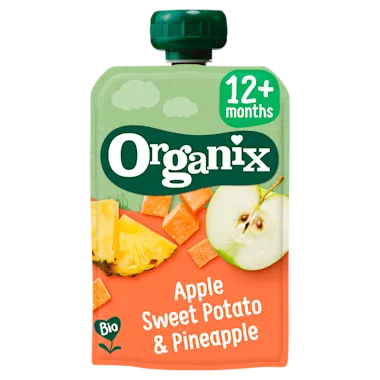 Een lekker 100% biologisch Organix fruithapje met appel, zoete aardappel en ananas in een handig knijpzakje. Het perfecte tussendoortje en ideale fruithapje voor je peuter!