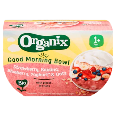 Een Good Morning Bowl met aardbeien, banaan, blauwe bes, yoghurt en haver van Organix is een lekker en verantwoord baby ontbijtje met echte stukjes fruit. Deze babyvoeding is rijk aan vezels en is 100% biologisch. Een heerlijk 3-in-1 fruithapje met yoghurt en haver in een herbruikbaar kuipje. Good morning!