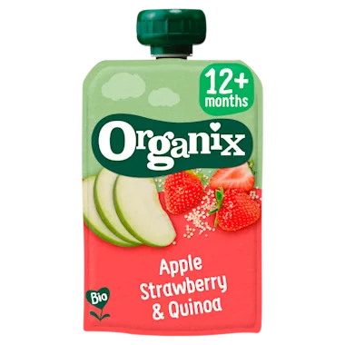 Een lekker 100% biologisch Organix fruithapje met appel, aardbei en quinoa in een handig knijpzakje. Het perfecte tussendoortje en ideale fruithapje voor je peuter!