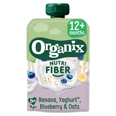 Organix Nutri Fiber knijpfruit met banaan, yoghurt, blauwe bessen en haver is rijk aan vezels en houdt je kleintje wel weer even zoet. Dit 3-in-1 knijpzakje met fruit, yoghurt en haver is het ideale knijpzakje voor onderweg. Uiteraard zonder toegevoegde suikers* en biologisch: zoals je van onze babyvoeding gewend bent! Geschikt als tussendoortje voor kleintjes vanaf 12 maanden. *Bevat van nature aanwezige suikers uit fruit.