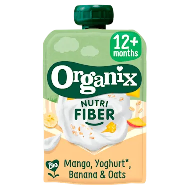 Knijpfruit van Organix met Mango, yoghurt, banaan en haver voor baby's vanaf 12 maanden. Dit fruithapje is een bron van vezels en gemaakt van biologische ingrediënten.