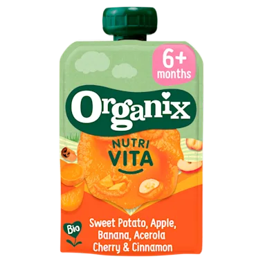 Knijpfruit van Organix met zoete aardappel, appel, banaan, kaneel en acerola kersen voor baby's vanaf 6 maanden. Dit fruithapje is een bron van vezels en wordt gemaakt van biologische ingrediënten.