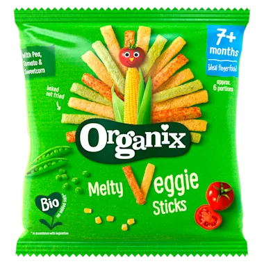 Een lekkere biologische melty baby snack in een handige zak met 3 verschillende groente sticks.