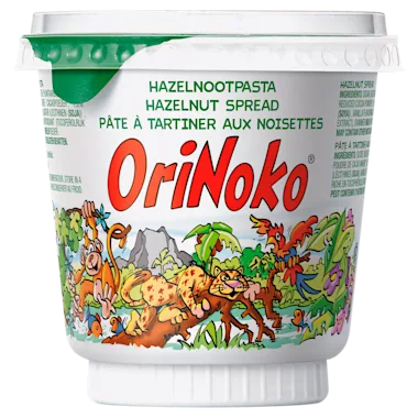 Ingrediënten: suiker, plantaardige oliën (raap, palm), 3% magere cacaopoeder, 2% HAZELNOTEN, emulgator (lecithinen), aroma (vanille), antioxidant (tocoferolconcentraat), magere MELKpoeder, SOJAbloem. Geproduceerd in een fabriek waar ook andere noten, gluten, en ei verwerkt worden.