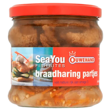 Ingrediënten: HARING (86% van het uitlekgewicht), water, natuurazijn, raapolie, TARWEbloem (GLUTEN), ui, wortel, zout, augurk, paprika, MOSTERDzaad, kleurstof E150d (karamel), natuurlijk ui aroma, zoetstof: sacharine.