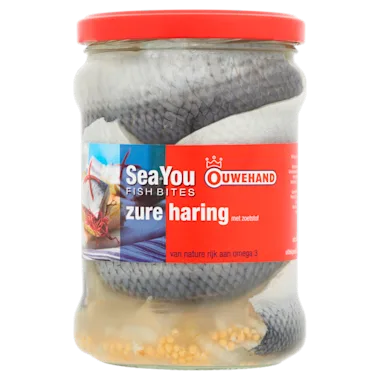 Ingrediënten: haring (VIS) (88% van het uitlekgewicht), opgiet (zout, natuurazijn, voedingszuur: melkzuur, natuurlijk aroma, zoetstof: sucralose), ui, MOSTERDZAAD, pimentkorrels, witte peperkorrels, gedroogde wortel.