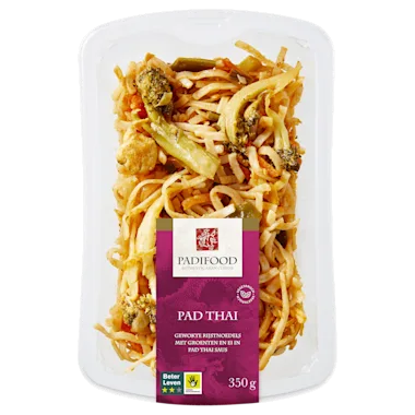 Gewokte rijstnoedels met groenten en ei in pad thai saus