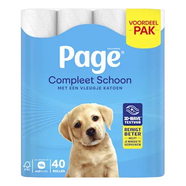 Page Compleet Schoon toiletpapier is speciaal ontwikkeld om een schoner resultaat te geven als ooit tevoren. Het toiletpapier reinigt beter en helpt je daardoor minder te gebruiken. Elk velletje is voorzien van onze unieke 3D Wave™-textuur, waardoor je een bewezen schoner resultaat krijgt met minder velletjes. Gebruik Page Vochtig toiletpapier na Page wc papier voor een schoon gevoel, de hele dag.
