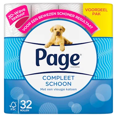 Page Compleet Schoon toiletpapier is speciaal ontwikkeld om een schoner resultaat te geven als ooit tevoren. Elk velletje is nu voorzien van onze unieke 3D Wave™-textuur, waardoor je een bewezen schoner resultaat krijgt met minder velletjes. Bovendien is elke toiletpapierrol nu nog zachter, voor de beste reiniging. Nu met een vleugje katoen. Gebruik Page Vochtig toiletpapier na Page toiletpapier voor een schoon gevoel, de hele dag.