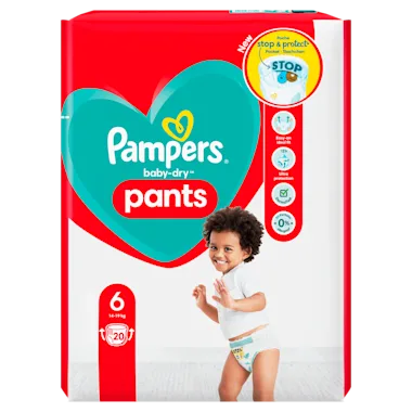 Pampers Baby-Dry luierbroekjes bieden tot 12 uur rondom bescherming tegen lekken dankzij de combinatie van een revolutionaire Stop & Protect Pocket en een 360° pasvorm.