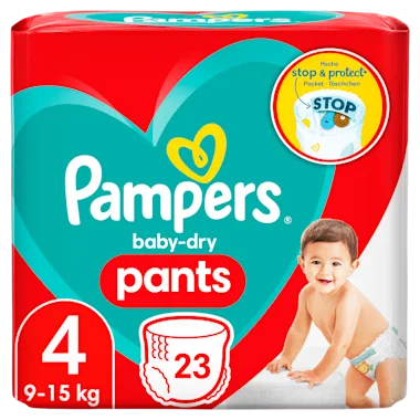 Pampers Baby-Dry luierbroekjes bieden tot 12 uur rondom bescherming tegen lekken dankzij de combinatie van een revolutionaire Stop & Protect Pocket en een 360° pasvorm.