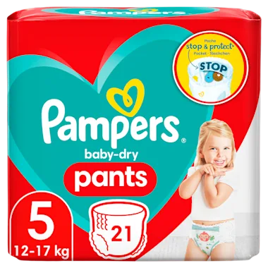 Pampers Baby-Dry luierbroekjes bieden tot 12 uur rondom bescherming tegen lekken dankzij de combinatie van een revolutionaire Stop & Protect Pocket en een 360° pasvorm.