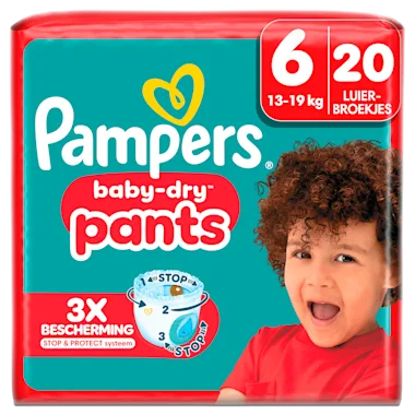 Zodra je baby begint te bewegen, is hij kampioen in rollen, zich uitrekken en klimmen om de wereld te ontdekken.  Je baby heeft onze Baby-Dry Pants nodig die de beste bescherming bieden tegen lekken: hun Stop & Protect Pocket helpt lekken aan de achterkant van het luierbroekje te voorkomen, hun 360° rekbare tailleband past zich aan het lichaam aan om openingen en lekken te voorkomen en dubbele beschermrandjes helpen lekken rond de beentjes voorkomen, en zorgen zo voor bescherming rondom tegen lekken tot 12 uur lang. Net als alle andere Pampers luierbroekjes zijn de Pampers Baby-Dry Pants heel eenvoudig te verschonen, zelfs als je baby veel beweegt: je trekt ze in één beweging aan, scheurt de zijkanten open om ze uit te trekken, rolt ze op en gebruikt de plakstrip om ze weg te gooien. Net zoals bij jou, komt jouw baby's veiligheid bij Pampers op de eerste plaats: Pampers Baby-Dry Pants luierbroekjes zijn dermatologisch getest en bevatten 0% EU-parfumallergenen (zoals gereglementeerd in de EU-regelgeving voor cosmetica (EC) No 1223/2009). Ze zijn goedgekeurd door de dermatologen van de Skin Health Alliance en getest en Standard 100 gecertificeerd door OEKO-TEX. Wil je weten wat de bestanddelen zijn van onze producten? Bezoek Pampers.nl