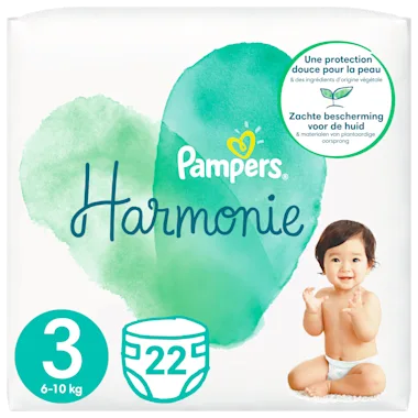 Pampers Harmonie luiers zijn hypoallergeen* en dermatologisch getest (*ontworpen om het risico op allergieën te beperken) Gemaakt met hoogwaardig katoen en zachte plantaardige vezels Zonder lotion, parfum, en zonder een van de EU 26 allergenen Tot 12 uur lang droogheid van Pampers Verantwoord geproduceerde cellulose Gecertificeerd door het onafhankelijk label Standard 100 van Oeko-Tex De verpakking bevat materialen van plantaardige oorsprong