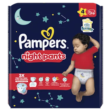 Geef je baby Pampers beste bescherming 's nachts met Pampers Night Pants: door hun superabsorberende kern zijn ze het meest absorberende product van Pampers en bieden tot 100% lekvrije nachten! Ze hebben ook een 360° tailleband die zich aan de nachtelijke bewegingen van je baby aanpast en een Stop & Protect pocket die lekken aan de achterkant helpt voorkomen! Net als alle andere Pampers luierbroekjes zijn de Pampers Night Pants heel eenvoudig te verschonen, zelfs als je baby veel beweegt: je trekt ze in één beweging aan, scheurt de zijkanten open om ze uit te trekken, rolt ze op en gebruikt de plakstrip om ze weg te gooien. Net zoals bij jou, komt jouw baby’s veiligheid bij Pampers op de eerste plaats: Pampers Night Pants zijn dermatologisch getest en bevatten 0% EU-parfumallergenen (zoals gereglementeerd in de EU-regelgeving voor cosmetica (EC) No 1223/2009). Ze zijn getest en Standard 100 gecertificeerd door OEKO-TEX. Wil je weten wat de bestanddelen zijn van onze producten? Bezoek Pampers.nl