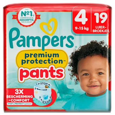 Als je baby actiever wordt, wil je een luier die zowel bescherming biedt als een comfortabele pasvorm heeft die zich aanpast aan alle bewegingen van je kindje. Geef je baby het beste comfort en de beste bescherming tegen lekken van Pampers met Premium Protection luierbroekjes: de 360° ultrazachte tailleband past zich aan het lichaam van je beweeglijke baby aan en hun Stop & Protect pocket helpt lekken aan de achterkant te voorkomen en biedt zo tot 12 uur bescherming rondom tegen lekken. Net als alle andere Pampers luierbroekjes zijn de Pampers Premium Protection Pants heel eenvoudig te verschonen, zelfs als je baby veel beweegt: je trekt ze in één beweging aan, scheurt de zijkanten open om ze uit te trekken, rolt ze op en gebruikt de plakstrip om ze weg te gooien. Net zoals bij jou, komt jouw baby's veiligheid bij Pampers op de eerste plaats: Pampers Premium Protection Pants zijn dermatologisch getest en bevatten 0% EU-parfumallergenen (zoals gereglementeerd in de EU-regelgeving voor cosmetica nr. 1223/2009). Ze zijn goedgekeurd door de dermatologen van de Skin Health Alliance en getest en Standard 100 gecertificeerd door OEKO-TEX. Wil je weten wat de bestanddelen zijn van Pampers producten? Ga naar pampers.nl