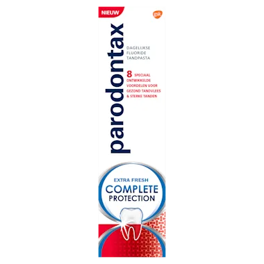 De tandpasta heeft acht voordelen voor gezond tandvlees en sterke tanden. Deze tandpasta is vier keer effectiever in het verwijderen van tandplak* en helpt je te zorgen voor gezond tandvlees, het voorkomen van een slechte adem en het in standhouden van de aansluiting tussen je tanden en tandvlees. br br Daarnaast zorgt Complete Protection tandpasta voor een diepe reiniging tussen je tanden en maakt schoon voor een fris gevoel. Parodontax Complete Protection tandpasta zorgt met fluoride voor sterker tandglazuur. br br strong De voordelen van Parodontax Complete Protection Extra Fresh Tandpasta: /strong br - Heeft 8 voordelen voor gezond tandvlees br - Helpt tegen en voorkomt bloedend tandvlees br - 4 keer effectievere tandpasta* in het verwijderen van tandplakbacteriën br - Dagelijkse natriumbicarbonaat en fluoride tandpasta voor gezond tandvlees br - Met fluoride voor sterker tandglazuur br br *de voornaamste oorzaak van tandvleesproblemen, vergeleken met een gewone tandpasta, bij 2 keer per dag poetsen, na 6 maanden gebruik.