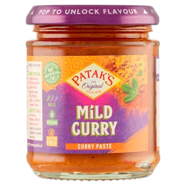 4 porties 1. BAK in 10min. in koekenpan 1 gesnipperde ui, 450 g kip/vis en groenten met 165 g Patak's paste in 2 el olie 2. VOEG voor 15min. 200 g tomatenblokjes en 400 ml kokosmelk toe en kook tot de ingrediënten gaar zijn.