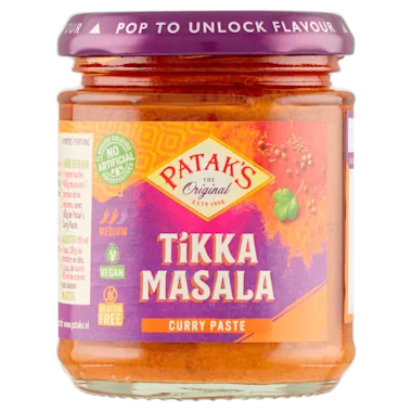4 porties 1. BAK in 5min. 1 gesnipperde ui, 450g kip/vis en groenten, met 165g Patak’s curry paste. 2. VOEG voor 15min. 150ml water, 200g tomatenblokjes, 1tl suiker en 150ml slagroom toe en LAAT zachtjes koken.