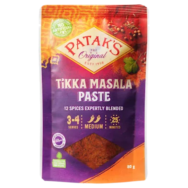 1) 2 min. BAK één gesnipperde ui in 2 el olie. VOEG het zakje Patak's currypasta toe en bak voor 1-2 min. VOEG 50 ml water toe en kook tot de gewenste dikte van de saus.
