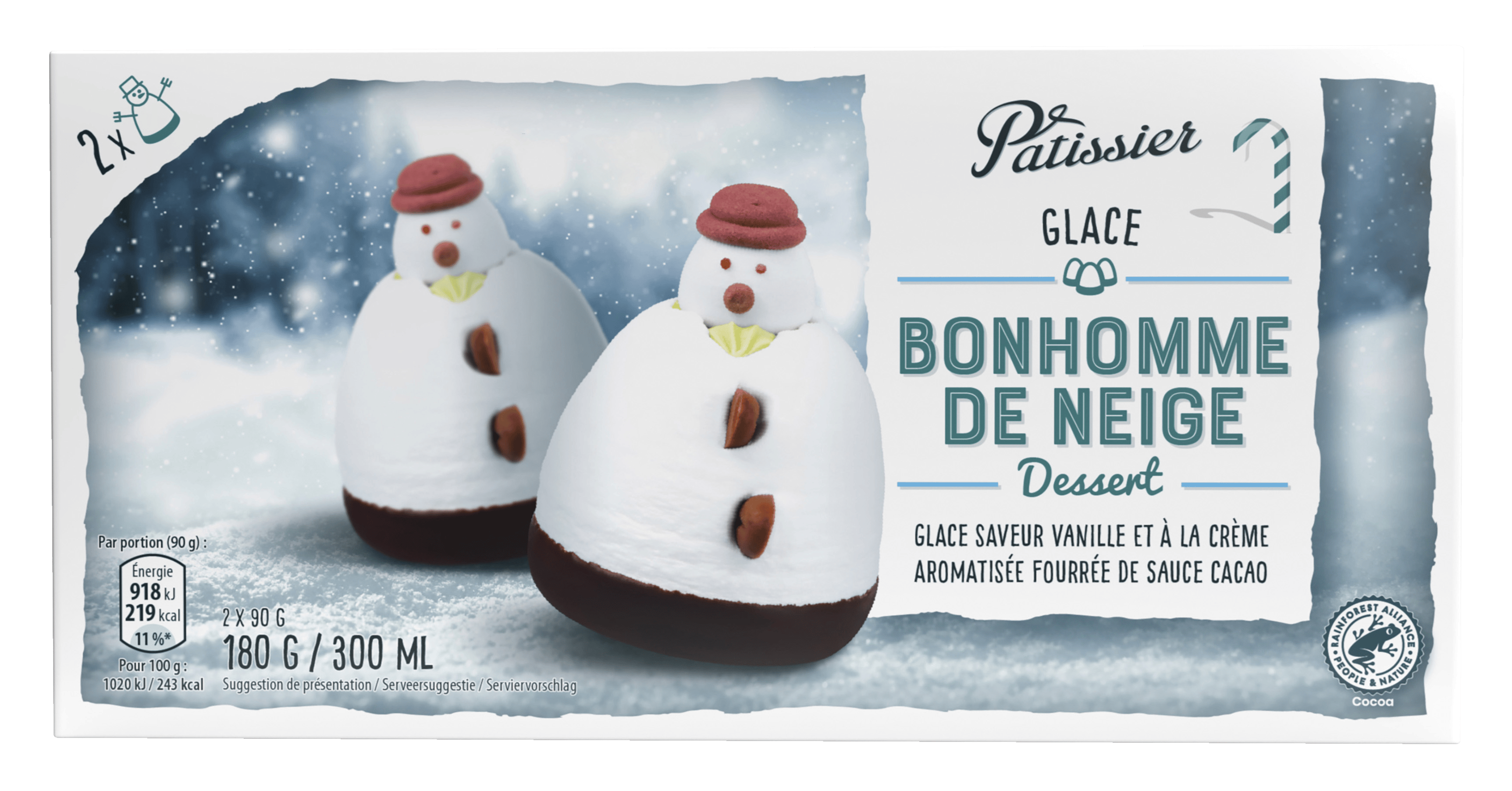 Ingrediënten: gerehydrateerde magere MELK, room (MELK) 19%, water, suiker, gekleurde suikerdecoratie 8,5% (rietsuiker, water, KIPPENEI-EIWIT, verdikkingsmiddel; Arabische gom; stabilisator: kaliumtartraat; kleurstoffen: riboflavinen, kopercomplexen van chlorofylen en chlorofylinen, anthocyanen, ijzeroxiden en -hydroxiden, bietenrood), cacaosaus 8,5% (glucose-fructosestroop, water, magere cacaopoeder* 8,0%, suiker, gemodificeerd maïszetmeel, emulgator: mono- en diglyceriden van vetzuren, zout, aroma), cacaofantasie 4,3% (cacaomassa*, plantaardige vetten en oliën (kokos, shea, zonnebloem), suiker, emulgator: zonnebloemlecithine; natuurlijk vanillearoma), LACTOSE, glucose-fructosestroop, chocoladedecoratie 2,1% ( suiker, cacaoboter*, volle MELKPOEDER, cacaomassa*, weipoeder (MELK), emulgator: SOJALECITHINE; gekarameliseerde glucosestroop, natuurlijk vanillearoma), MELKEIWIT, emulgator: mono- en diglyceriden van vetzuren; natuurlijk roomaroma (MELK), stabilisatoren: guarpitmeel, carrageen, johannesbroodpitmeel, aroma. KAN SPOREN VAN AMANDEL, HAZELNOOT, WALNOOT, CASHEWNOOT, PECANNOOT, PARANOOT, PISTACHE EN MACADAMIA BEVATTEN. *Rainforrest Alliance gecertificeerd. Lees meer op www.ra.rg.