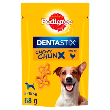 Pedigree Dentastix Chewy Chunx is een heerlijke hapklare verwennerij. Ze zijn speciaal ontwikkeld met actieve ingrediënten, die wetenschappelijk bewezen de tanden van je hond schoon houden. De snacks zijn niet alleen goed voor het gebit van je hond, maar hij zal ze ook heerlijk vinden door de lekkere kip smaak.