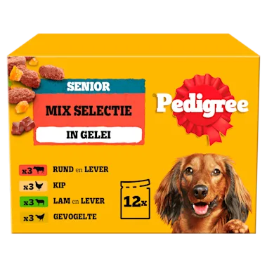 De PEDIGREE® Multipack Senior Maaltijdzakjes bevat natvoeding in gelei, speciaal afgestemd op de behoeften van ouder wordende honden. Voorzien van gezonde voedingsstoffen en alles wat uw hond nodig heeft. Een multipack bevat 12 maaltijdzakjes met 4 smaakvarianten.
