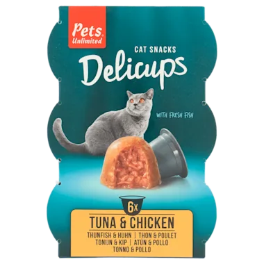 Samenstelling: tonijn (76%), zalm (10%), kip (8%), visbouillon (water, 10% tonijn, 10% zalm), rijstzetmeel.