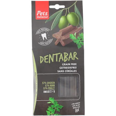 De Pets Unlimited Dentabar ondersteunt de dagelijkse tandverzorging van honden. Deze natuurlijke snack is rijk aan kip, omega 3 en omega 6. Voor een frisse adem!