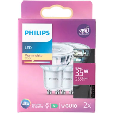 Vervang 2 oude spotlampen door deze nieuwe energiezuinige Philips LED-spots, met warmwit licht, en bespaar tot €30 op energiekosten per lamp per jaar. Deze standaardlampen verbruiken tot 90% minder energie dan gloei- en halogeenlampen dankzij de nieuwste energiezuinige LED-technologie. Daarnaast gaan ze gaan tien keer langer mee. Met EyeComfort, voor licht dat aangenaam is voor jouw ogen. Deze lampen hebben een GU10-fitting en gaan vaak perfect samen met jouw in- of opbouwspots.