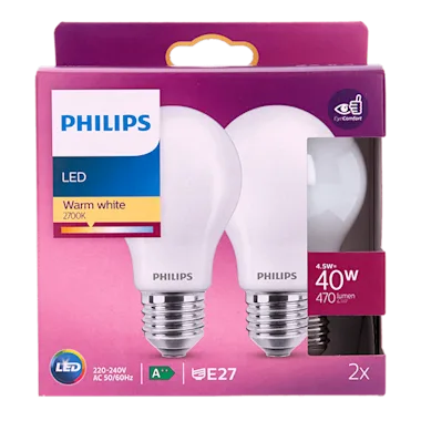 Vervang je oude lamp met een nieuwe energiezuinige Philips LED-lamp, met warmwit licht. Deze standaardlampen verbruiken circa 80% minder energie dan traditionele lampen dankzij de nieuwste energiezuinige LED-technologie en ze gaan tien keer langer mee. Met EyeComfort, voor licht dat aangenaam is voor jouw ogen. Deze lampen hebben een E27-fitting, en passen dus in de meeste lampen met grote fitting.