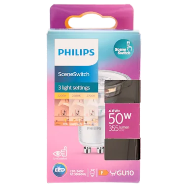 | Met de Philips SceneSwitch LED-spot kun je met jouw bestaande schakelaar eenvoudig het lichtniveau aanpassen, van helder licht naar natuurlijk licht of een sfeervolle, warme gloed. Je hebt geen dure dimmer of aanvullende installatie nodig. Bovendien heeft deze lamp een geheugenstand; daardoor onthoudt de lamp de laatste lichtstand, wanneer je de lamp voor langere tijd hebt uitgeschakeld. Met EyeComfort, voor licht dat aangenaam is voor jouw ogen. Deze lamp heeft een GU10-fitting en gaat vaak perfect samen met jouw in- of opbouwspots. | Branduren: 15000 uur | Indicatie Dimbaar: Ja | Indicatie Schakelaar: Ja | Indicatie met afstandsbediening: Ja | Indicatie smarthome: Ja | USB Connectors: Ja - stuks | Energie label: f |