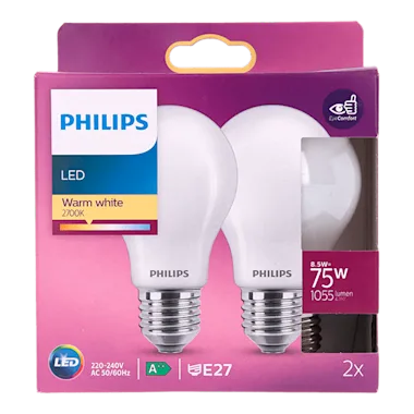 Vervang je oude lamp met een nieuwe energiezuinige Philips LED-lamp, met warmwit licht. Deze standaardlampen verbruiken circa 80% minder energie dan traditionele lampen dankzij de nieuwste energiezuinige LED-technologie en ze gaan tien keer langer mee. Met EyeComfort, voor licht dat aangenaam is voor jouw ogen. Deze lampen hebben een E27-fitting, en passen dus in de meeste lampen met grote fitting.