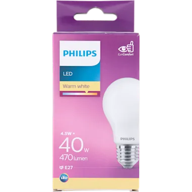 Vervang je oude lamp met een nieuwe energiezuinige Philips LED-lamp, met warmwit licht. Deze standaardlamp verbruikt circa 80% minder energie dan traditionele lampen dankzij de nieuwste energiezuinige LED-technologie en ze gaan tien keer langer mee. Met EyeComfort, voor licht dat aangenaam is voor jouw ogen. Deze lamp heeft een E27-fitting, en past dus in de meeste lampen met grote fitting.