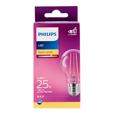 Vervang je oude lamp met een nieuwe energiezuinige Philips LED-lamp, met warmwit licht. Deze standaardlamp verbruikt circa 80% minder energie dan traditionele lampen dankzij de nieuwste energiezuinige LED-technologie en ze gaan tien keer langer mee. Met EyeComfort, voor licht dat aangenaam is voor jouw ogen. Deze lamp heeft een E27-fitting, en past dus in de meeste lampen met grote fitting.