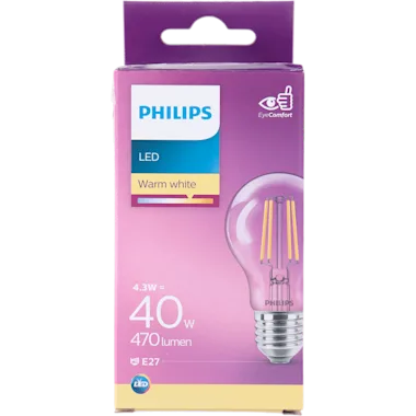 | Philips ledlamp met E27 fitting bestellen? | Deze ledlamp van Philips biedt warmwit licht dat comfortabel is voor de ogen. Met dit warme licht creëer je gemakkelijk een rustgevende sfeer. De lamp geeft warm licht met een lichttemperatuur van 2700 K. Deze lamp heeft een lichtopbrengst van 470 lumen. Bovendien biedt deze energiezuinige ledlamp 15000 lichturen. De lamp heeft energielabel A++. | Vervang je oude lamp met een nieuwe energiezuinige Philips LED-lamp, met warmwit licht. Deze standaardlamp verbruikt circa 80% minder energie dan traditionele lampen dankzij de nieuwste energiezuinige LED-technologie en ze gaan tien keer langer mee. Met EyeComfort, voor licht dat aangenaam is voor jouw ogen. Deze lamp heeft een E27-fitting, en past dus in de meeste lampen met grote fitting. | Branduren: 15000 uur |