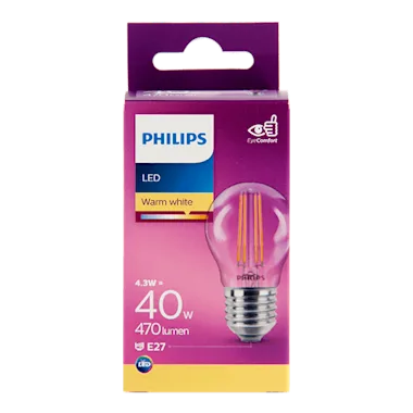Vervang je oude kleine kogellamp met een nieuwe energiezuinige Philips LED-lamp, met warmwit licht. Deze lamp verbruikt circa 80% minder energie dan traditionele lampen dankzij de nieuwste energiezuinige LED-technologie en ze gaan tien keer langer mee. Met EyeComfort, voor licht dat aangenaam is voor jouw ogen. Deze lamp heeft een E27-fitting, en past dus in de meeste lampen met grote fitting.